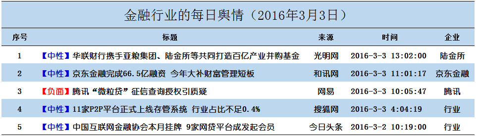 乐思舆情监测中心金融行业热点话题板块数据显示:2016年3月3日的热点舆情话题分别是以下5条: