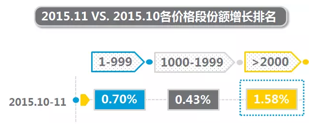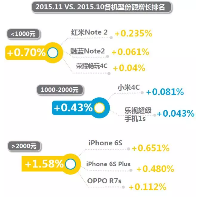 2015年电商节达到了史无前例的高潮,各电商销售再创新高。智能机品牌厂商也都将其作为提升销售的重要时点。作为最受关注之一的智能机品类,其表现究竟如何呢?我们选取2015年上市的机型,对各机型2015年11月底较10月底的份额增长大小进行排名,每个价格段分别取Top10机型。