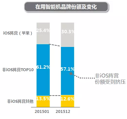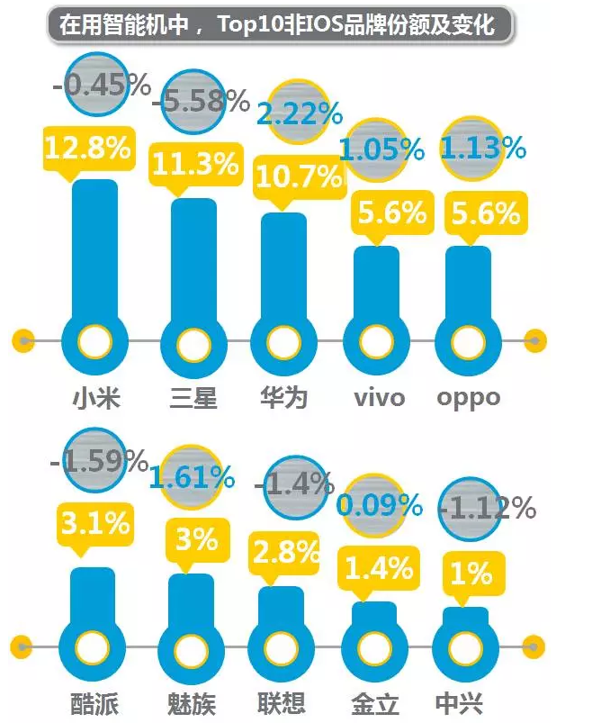 而非iOS阵营中,华为领涨,其市场份额增长超过2%,达到10.7%。涨幅紧随其后的依次是魅族(1.61%)、OPPO(1.13%)、vivo(1.05%)和金立(0.09%)。小米2015年的市场份额小幅下降。三星的市场份额下降超过5%,降至11.3%。酷派、联想和中兴的市场份额都出现不同幅度的下降。