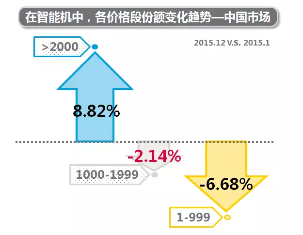 报告称,2015年,中高端智能手机(2000元以上机型)的整体份额从36.9%增至45.7%,增长近9%,而1000元以下机型的整体份额下降最为明显,降幅超过6%。