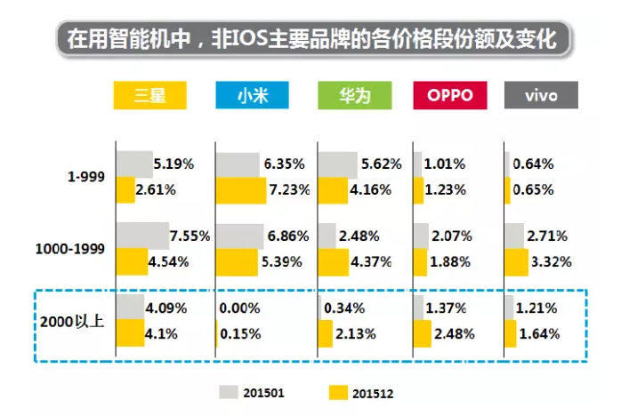 考虑到2000元以上市场的迅猛增长,在中高端上突破十分关键。2015年,华为、OPPO和vivo在该市场取得了不俗的战绩,份额已逼近三星。其中华为的Mate7,OPPO的R7和vivo的X5Pro均成为份额超过0.3%的明星机型。
