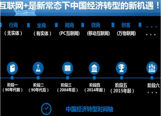 “互联网+”是新常态下中国经济转型的一个新机遇,我把几个业态分了一下。90年代更多的是挑着鸡毛换糖的行走的行商。90年代之后,有了坐商,批发市场等实体的零售产业。再一个是2004年之后,网商的群体开始逐步兴起,更多是以PC互联网为重要依托的经营载体。2015年开始,以微信互联网为载体的微商进入我们的眼界,而2016年又有一个词“创客”进入我们眼前。创客今后有很多的载体,而更多是基于万物联网来展开的。