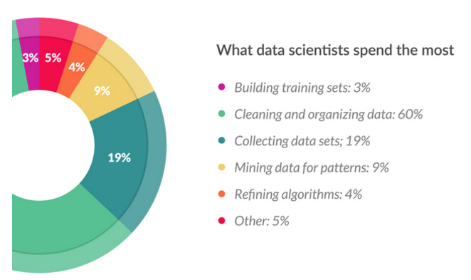 通常,拥有高学历的人都想要做数据科学家这样的工作,但是60%以上的人说,他们大部分的时间都花在清理和组织数据上,花在分析任务、构建训练几何、研究算法上的时间很少。