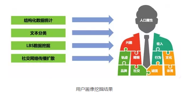 个人用户画像研究的结果就是把结构化数据,文本分类,LBS数据,社交网络传播扩散这些挖掘之后形成一个比较完整的画像,比如说人口的一些基础属性如年龄、家乡、兴趣等。同时也会对用户婚姻状况来做一个判断。有了这些数据之后,就可以基于这些用户数据去做很多社交征信工作。
