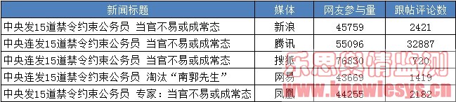 新年伊始,中央连发15道禁令约束公务员引来众目关注。17日媒体报道该新闻吸引众多网友参与话题议论和跟帖。据乐思舆情监测系统的采集的数据统计,截至17日17时,来自搜狐、新浪、网易、腾讯、凤凰五大门户网该新闻的报道已有超过20万网友参与,跟帖接近4万条。统计网友的评论可知,对于中央的15道禁,舆论态度各异,其中能否有效执行备受公众期待。