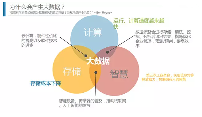 所以,存储成本的下降,计算速度的提高和我们对智慧的渴望,是产生大数据的三个重要因素。