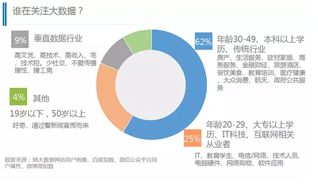 事实上,在关注大数据的人群中,有62%的人群为年龄30-49岁、本科以上学历的传统行业人员,他们来自房产、生活服务、建材家居、商务服务、金融财经、旅游酒店、餐饮美食、教育培训、医疗健康、大众消费、航天、政府公共服务等多个领域;