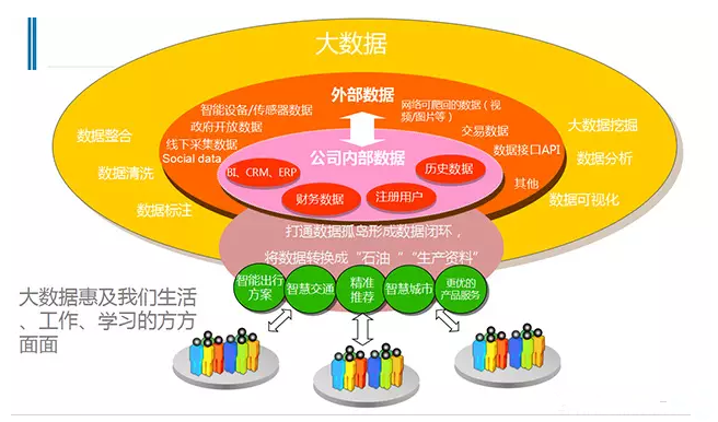 整合完公司内部外部数据进行大数据存储,然后通过清洗,标注、去重、去噪、关联等过程可以将数据进行结构化,也可以进行大数据挖掘和数据分析,再以数据可视化呈现结果,打通数据孤岛形成数据闭环,将数据转换成“石油”和“生产资料”,最后应用到我们日常的生活、学习和工作中去。