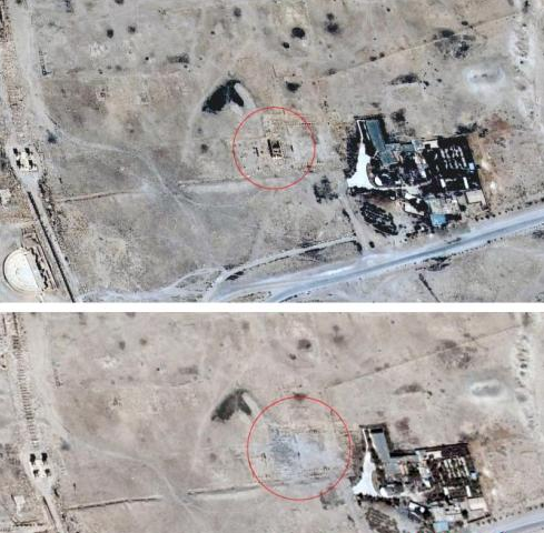 当地时间2015年8月27日,叙利亚帕尔米拉,卫星云图显示遭IS极端武装炸毁前后的巴尔-夏明神庙地区对比图。