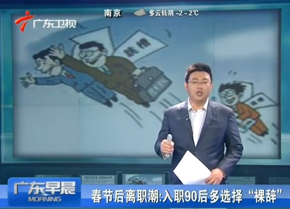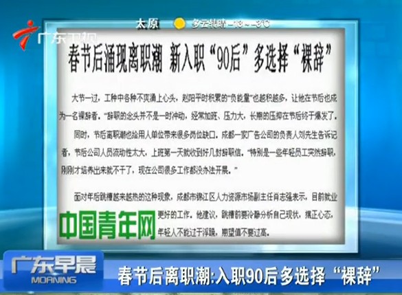 从系统抓取的舆情曝光信息可知,在这股春节后现离职潮中,90后上班族扮演了重要角色,并给这种离职取了一个非常好听的名字——裸辞!有关人士表示,春节后现离职潮很大原因可能源于春节期间朋友间的攀比和亲友的“考问”。