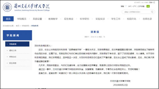 (图1:兰州交通大学博文学院官网贴出的道歉信)
