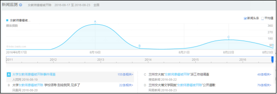 从8月19日到8月23日,百度新闻头条关于“兰州高校女教师患癌被开除”的事件,新闻头条标题的变化脉络:大学女教师患癌被开除事件调查——大学女教师患癌被开除 学校领导:别给我哭,见多了——兰州交大就‘女教师患癌被开除’派工作组调查——兰州交大博文学院就‘女教师患癌被开除’公开道歉,事件经过5天发展,问题已经基本已经得到解决。