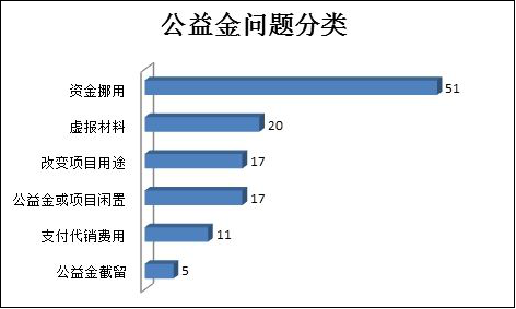 “公益金问题分类”图分析,问题义工分为6大类。其中资金挪用已经成为了主要问题,占问题总量的51%,可谓是半壁江山的权重;其次虚报材料、改变项目用途、公益金或项目闲置也是重要的问题之一。