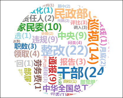 以新闻“18省套取挪用公益金 民政部称整改率97% ”原文分析所得,词云图中关键词“干部”字体最大,且出现了24次,成为了热词词频的主题词,也是舆情的焦点所在;其次关键词“整改”和“巡视”分别出现了22次和14次,关注度分居二、三位。