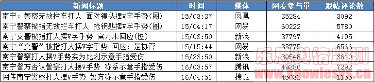 南宁警察拦车打人事件在网上曝光后,事件话题的舆情热点直线上升,参与话题议论网友数超过20万。统计乐思网络舆情监测系统搜集的各类数据可知,截至2月16日15时30分,仅腾讯、新浪、网易、凤凰和搜狐等五门户的报道网友参与量达292044人,跟帖31690条。从网系统监测各方言论分析,话题焦点集中在围绕着警察是否打人?打人警察应该如何处置等问题上。