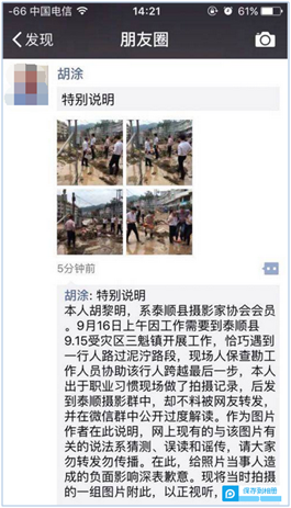 受强台风影响,浙江省温州市泰顺县近日遭遇强降雨、受灾严重。在该县动员救灾期间,一张泰顺县教育局计财科科长包序威靠他人搀扶过淤泥的图片引发网友热议。事件发生后,泰顺县教育局9月16日下午通报,涉事人现已免职接受调查。而包序威表示:并没像网上传的那样让人抬着去了解灾情,只是在别人帮助下过了一处淤泥。与此同时,拍照者胡黎明则在朋友圈发辟谣申明并致歉。