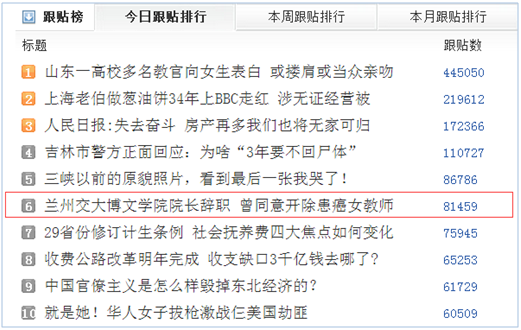 从网易今日跟帖排行榜中可以看到,该条新闻排在榜单的第六位,跟帖量达到81,459条。在“刘伶俐事件”曝光以后,舆论纷纷谴责陈玲的行为,揭露其学历造假,曝光学院对待教师的不公问题。然而,校方这种以陈玲自愿辞去院长职务来了结该事件的行为,舆论显然“不买账”。