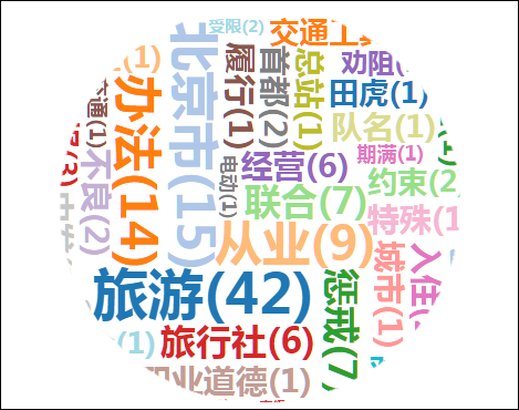 以标题为“北京出台旅游不文明记录管理暂行办法 游客上黑名单住店时将受限”的新闻进行热词分析,得到图4,即热词词频图。由热词权重图可以看出,“旅游”“北京市”“办法”这三个词的字体最大,颜色最重,是本条新闻的关键词也是此次舆情事件的核心所在。
