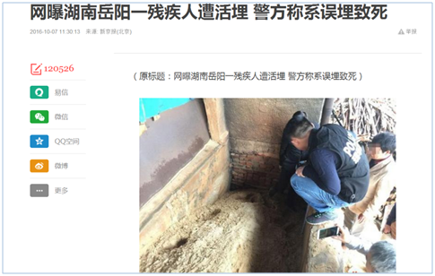 新闻“网曝湖南岳阳一残疾人遭活埋 警方称系误埋致死”截止目前已经收到评论120,526条。公众关注焦点在于“受害人是否真的如警方通报的那样是被误杀。”
