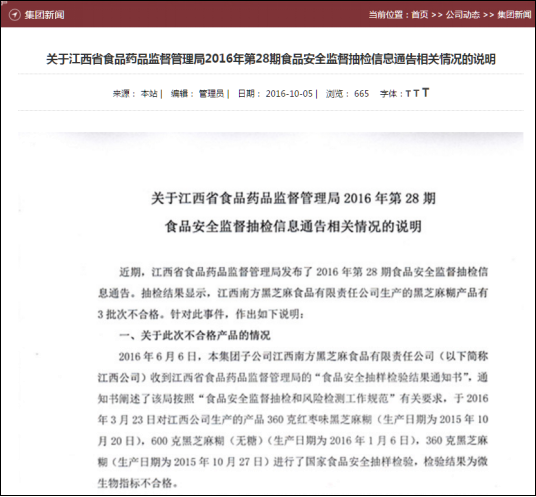 2016年10月2日,《每日经济新闻》报道了南方黑芝麻3批次产品被江西省食药监局通报为不合格产品,查处之后问题产品仍然没有下架。随后,南方黑芝麻集团于10月5日在官网发文表示回收了154袋产品。10月9日,记者致电南方黑芝麻集团,公司办公室一位工作人员称,一切以公司官网说明为准。