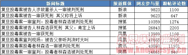 复旦投毒案完成一审判决,被告获死刑,该新闻报道后再次在网上引起热议。据乐思舆情监测系统对该话题的监测数据显示,截至18日17时,仅凤凰、网易、搜狐、腾讯和新浪五大门户的报道就吸引超过18万网友参与话题议论,跟帖超过2万条。对于被告父亲表示上诉,网友纷纷难言愤怒之情,舆论支持原判的声音高涨,但也有部分网友表示父亲上诉可以理解。