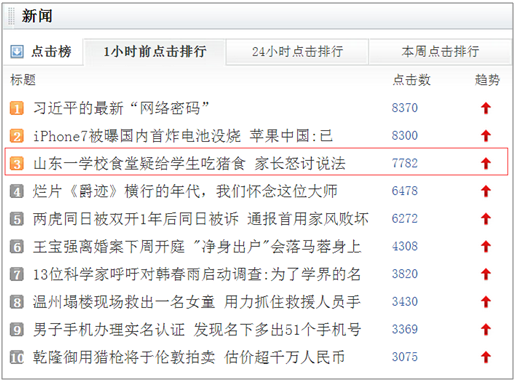 从搜狐新闻实时点击排行中可以看到,“山东一学校食堂疑给学生吃猪食 家长怒讨说法”排在该榜单的第三位,点击量为7,782条,热度持续发酵。舆论谴责学校这种为了利益不惜损害孩子健康的行为,质疑学校饭堂承包存在的灰色利益输送链,学校也因此陷入了舆论的漩涡。