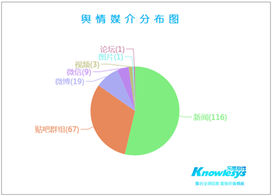 从舆情媒介分布来看,新闻媒体成为事件报道的主力,新闻采集量为116条,占比53.7%,其次是贴吧群组,采集量67条,占比31.02%,微博以19条,8.8%排在第三。此次舆情事件的引爆点是微信群和微信朋友圈,有些愤怒的家长甚至声称转发有关信息,凭朋友圈截图能获得10元红包。