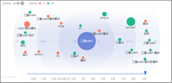 从需求图谱分析,关键词“三星note7”相关性链条中“note7国行爆炸”的词圈属于上升趋势中最大的搜索指数,是10月份以来最大的舆情关注点,也是公众在百度上对三星公司搜索最多的关键词。