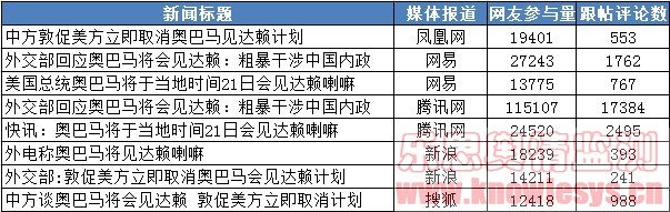奥巴马将会见达赖的消息一经媒体报道就迅速传遍网络,各大门户和媒体纷纷对奥巴马将会见达赖的事件展开重点报道,一时间舆论对于奥巴马将会见达赖事件的不满情绪充满网络。据乐思网络舆情监测系统该话题的监测数据可知,截至21日15时,新浪、腾讯、搜狐、凤凰和网易等五个门户有关奥巴马将会见达赖话题的报道吸引了超过25万人,跟帖2万条。从抽样统计网友的留言来看,有超过95%的言论直接表达对美国、奥巴马和达赖等人的不满。