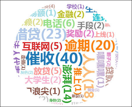 根据标题为“网贷背后灰色催债链 催债群交流如何打人不留痕”原文分析所得,词云图中关键词“催收”“借贷”“逾期”字体最大颜色最深,其中关键词“催收”出现了40次,“借贷”出现了23次,“逾期”出现了20次,这三个词即是公众关注的焦点又是舆论热议的重点。