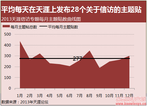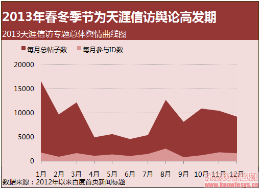 正常情况下,上访者一般通过书信、电子邮件、传真、电话、走访等多种方式进行上访,但在进行正当途径上访受阻的情况下,会通过网络舆论的形式进行上访,产生舆论压力,引起领导人的重视。从2013年信访舆情走势图可知,天涯舆情类帖子主要集中于1月、3月、8月、10月、11月、12月。其中1月、3月、8月、10月、11月、12月为天涯论坛信访舆情曝光和网友参与的高峰期,平均每月有1500位网友参与话题讨论,每月上访贴文数量最高达到438条,最低为191条,月平均上访贴文为277条。这些数据说明,一般年头岁末是网络信访类舆情的高发期,网友话题参与积极性强,这一时期容易引发影响较大的信访舆情事件。因此信访部门在进行信访舆情监测和处置的过程中,注意提升春冬季节的舆情监测密度和强度,争取能够及时发现问题,在危机爆发前有效的解决信访中存在的问题,合理引导,防止舆论影响的恶化,有效的维护相关负责部门的公众形象。