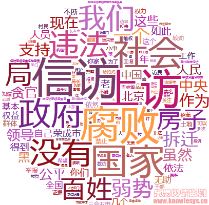 上访原因:解决、举报、腐败、问题、拆迁、非法、违法、维权、复查、复核、保护、投诉、公道等关键词。从上访原因关键词来看,促成上访事件产生主要是因为上访者权益遭到侵害,为维护自身利益,寻求公平公道的待遇而走上上访之路。