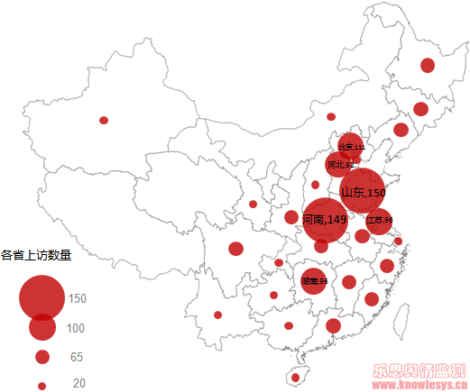 从天涯上曝光的信访舆情事件来源点分布看,山东省、河南省作为人口大省成为天涯上访的重灾区,北京市、江苏省、湖南省、河北省、黑龙江省、浙江省、广东省、湖北省等网友在天涯论坛上频繁上访。从信访事件分布图来看,信访舆情高发区一般都是经济发达的东部或者是处在快速发展的中部地区,一方面,这些地区受到经济发展的需要影响,土地征用事件发生概率大大增大,这就涉及到很多利益纠纷,一旦处理不当就容易引发民众上访。另一方面,受到当地民众的文化程度、社会文明程度和法制观念影响,民众的维权意识越来越强,这也是导致司法检举类和申诉信访办类信访事件增多的一个重要因素。因此,作为信访舆情事件频发的集中区,当地政府或相关部门应做好舆情预警,熟悉信访舆情应对和处置业务的准备,及时发现问题,正面引导,快速处置,把舆情危机扼杀在萌芽状态。(注:圆半径=各省的上访事件总量/圆周率)