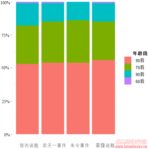 在信访话题中,90后所占的比例明显比其他话题多,信访话题年轻化,一方面是上访者可能是年龄较高者,通过熟悉网络的家人参与网络信访;另一方面上访中会存在不少的上访专业户,不惜倾家荡产,世代上访,直到问题解决了为止,当上一代因故不能上访时,年轻的一代便会接下重任,走上继续上访的道路。