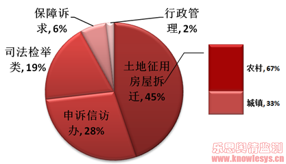 从乐思舆情系统采集的3318条信访类主题帖来看,土地征用与房屋拆迁占据天涯上访事件总数的45%,在一定程度上说明,土地征用与房屋拆迁成为访民上访的疑难问题,一方面是因为访民缺乏必要的实事依据,另一方面此次事件涉及的访民大部分是农民。因此每年应该更加关注进行土地征用和房屋拆迁的地区,先提前妥善解决此类事件纠纷的发生,在一定程度上降低信访事件的发生,减少信访舆情事件曝光量。