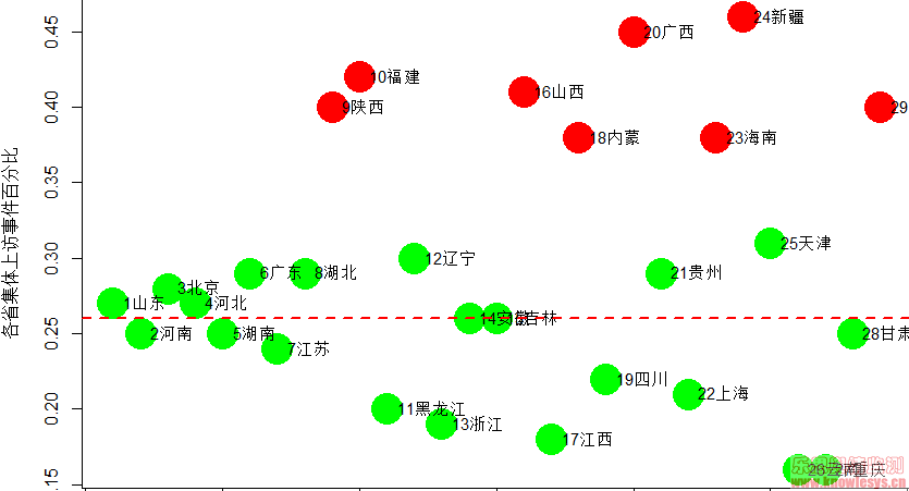在出现上访事件时,正常情况下事件涉及的人数越多,其产生的影响越大, 其舆情负面等级也会越高,因此集体上访事件需更受信访部门的高度关注。统计天涯上访事件中涉及集体上访事件数量可知,山东省、河南省、北京市等上访量前8位的省份,其集体上访数量所占的比例均在平均线附近,信访舆情压力相对较小,而排名靠后的经济相对落后省份,则更容易爆发集体性上访事件。鉴于集体上访事件可能会造成的影响,集体上访事件高发区一方面需提升网络舆情的监测预警能力,做到在事件发酵前及时发现,快速遏制,彻底化解。另一方面更要完善信访制度,让访民有话能说,说话有人听,诉求能及时解决。(注:序号=各省上访事件总量排名,红线代表全国平均集体上访比例0.26)
