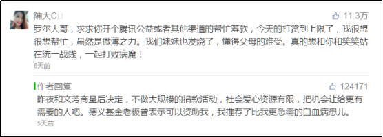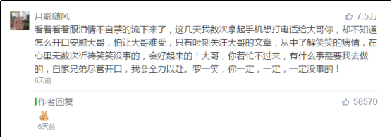 11月30日前,从罗尔的微信公众号《罗一笑,你给我站住》一文的热门评论截图可见,大量的网友表示支持罗尔,对于他文章刻画的感动,真挚的祝福,甚至还有个别网友因为打赏无门,求罗尔开通腾讯公益或者其他渠道筹款,罗尔作为好父亲的形象深入人心。
