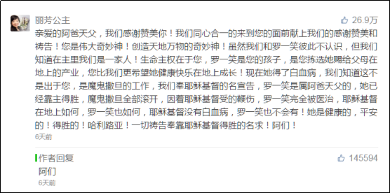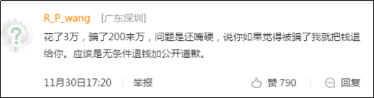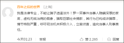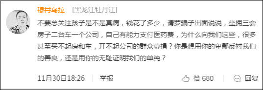 从11月25日舆情始发至今已经过去了6日,“罗一笑事件”仍然没有结束,网络舆论声势越来越浩荡,最初的同情牌已经被负面舆论淹没,30日后网友激烈的言论和真相出来之前的温柔鼓励形成极大的反差,主流媒体积极跟进报导,迫于舆论的压力,11月30日罗尔接受采访回复:“没想到会有这么大的影响,我会退钱给他们。”显然这样的答复难以服众,越来越多的网友开始猛烈抨击,其“三房两车一公司”的殷实家底成了网友炮轰的切入口。