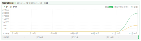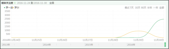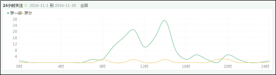 从360数据平台的三个指数指标:“搜索指数趋势”、“媒体关注度”、“24小时关注”来分析,11月29日至30日,关键词“罗尔”和“罗一笑”搜索指数均出现了高潮,媒体指数的高潮的出现,关键词“罗尔”早于“罗一笑”,前者在11月29日媒体关注度达到顶峰,后者在11月30日达到顶峰;一天24小时中,舆论的关注时间段集中在8时~16时,也就是白天时段。