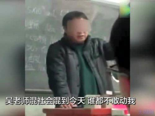 2近日,有网友微博爆料菏泽一中学男老师在课堂上训话时的视频。视频显示,3分钟左右的时间里,该教师不断口出脏话,声称“谁敢惹我,我打断他腿、弄死他,武老师就是有这个气势”,并称自己就是这样“混社会”的,为学生树立个榜样。其间,该教师不断发表“无论多大的官,我站在那,谁都不敢说我”“武老师混社会混到今天,大小校长谁都不敢把我怎样”“你官多大关我什么事,我又不求你办事,你过你的高官俸禄,我过我的平民生活”等言论,最后强调“同学之间没什么可比的,只要奋斗,谁都不能把你怎样”。