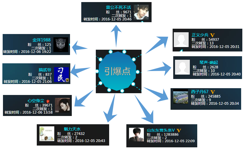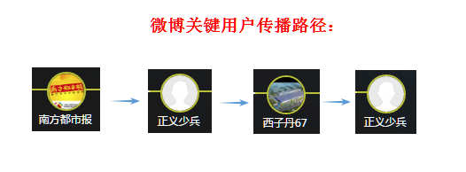 从微博关键用户的传播路径来看,微博始源于@南方都市报,然后经过@正义少兵、@西子丹67两大关键用户的转发成功将“中学男老师课上飚脏话 谁敢惹我打断他退”传递给其他微博受众,除此之外引爆点还有@琴声响起、@山东东营头条、@魅力天水、@心空身尘、@搞贰爷、@金洋1988和@雷公不死不活等众多大号微博。