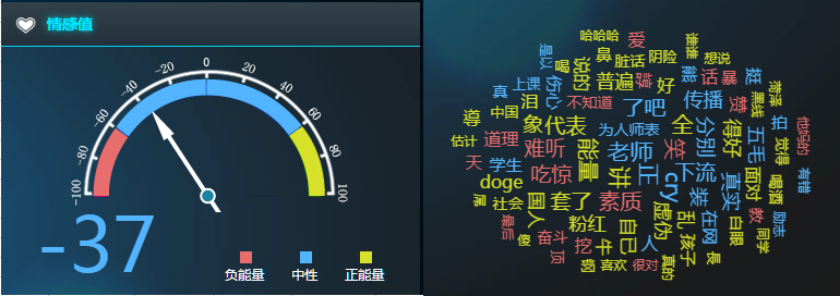 对该微博的转发文本进行自然语言处理后,所得出的情感倾向判断为-37,情感值属于中性偏向负能量,从提取的情感词来看,负面词主要是:“素质”、“难听”、“吃惊”等,正面词主要有:“老师”、“代表”、“赞”。