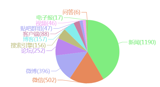 “攀枝花枪击案”舆情构成媒体类型图中,数据量最多的是新闻,达1190条,占比41.6%,排在第二位的是微信,数据量502条,占比17.5%,排在第三的是微博,数据396条,占比13.81%。新闻做为主流媒体占比较大,对于舆情的引导起着至关重要的作用。