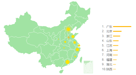 在“微信小程序”地域舆情的分布中,地域舆情声量最高的省份是广东省、北京市和浙江省,除此之外,沿海地区地域舆情热度普遍较高,山东省、江苏省等,地域舆情也是走势较高。相对于沿海地区而言,内陆的舆情热度就比较弱,几乎没有形成地域舆情圈。