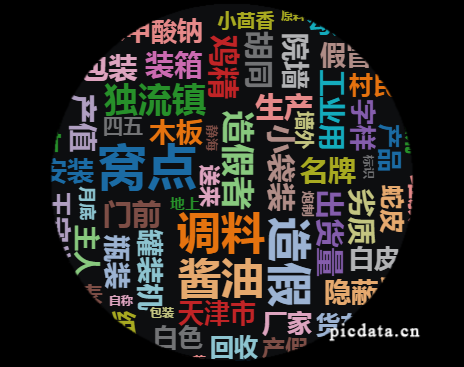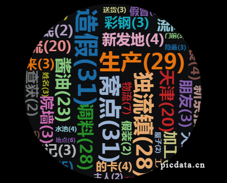 根据凤凰资讯发表的《北方调料造假中心年产值过亿 老板开保时捷》新闻进行分析,关键词“造假”、“窝点”、“生产”、“调料”、“独流镇”几个关键词字体最大,出现的频率也最高,其中关键词“造假”和“窝点”分别出现了31次,排在关键词热度榜第一;“生产”排在第二,出现频率为29次;排在第三位的是“调料”,出现频率为28次。
