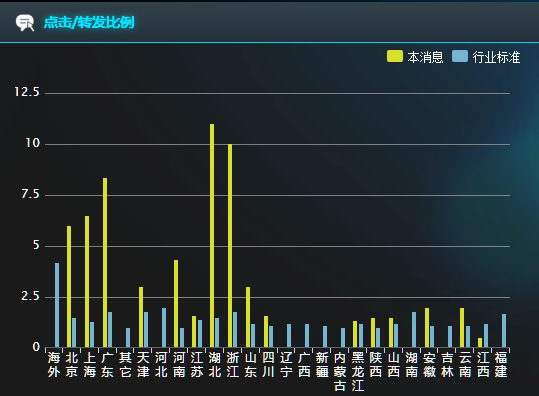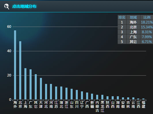 从微博点击地分析,在舆情的传播过程中,对于新舆情最为关注(即点击最多)的地区是海外、北京、上海、广东,总的来说经济越发达,舆情就越容易传播。在点击/转发比例中,本舆情远高于行业标准的是北京市、上海市、广东省、湖北省和浙江省。