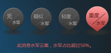 “北方调料造假中心产值过亿,老板开保时捷”舆情经过分析,怀疑此消息水军云集,占比超过50%,为重度水军比例。在这个互联网经济时代,常有营销商投放水军影响舆情的操作,导致内容消息的失真。