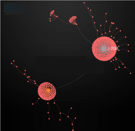 上图为“戴尔电脑四连爆”舆情传播路径,灰色节点为根节点。传播第一层转发占比62.4%,最大深度为6。其中“人民网”和“清华南都”成为传播的两大关键用户,带来的二次转发用户占总传播比例的62.4%,节点路径呈球形显示。