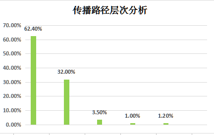 传播路径层次分析图中,第一层转发占比62.4%,第二层占比32%,第三层占比3.5%,第四层占比1%,第五层占比1.2%。从转发路径层次的分析中可见,第一层用户的粉丝量很大程度上决定了该舆情的曝光量已经各层次的转发占比。