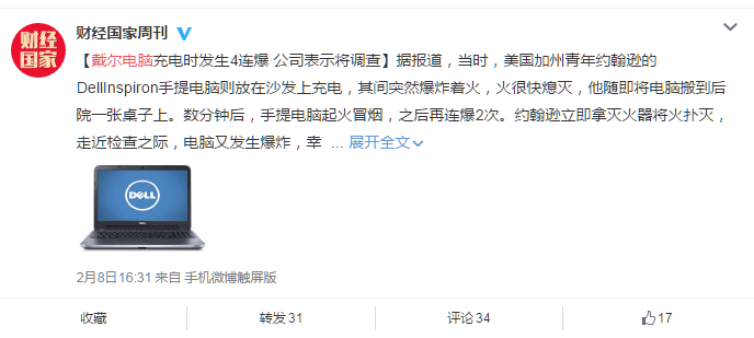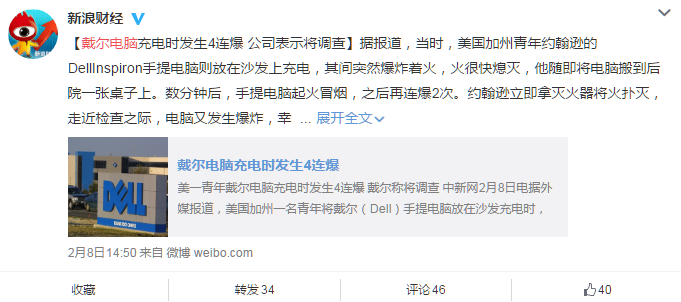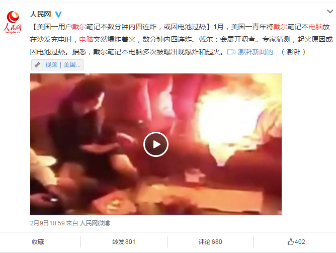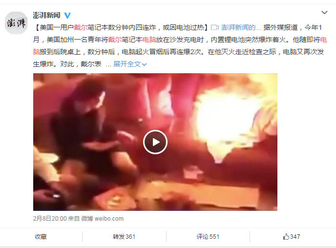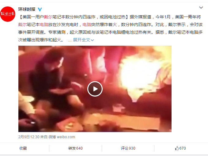 @柳凌萧:戴尔笔记本电脑电池爆炸值得警惕…